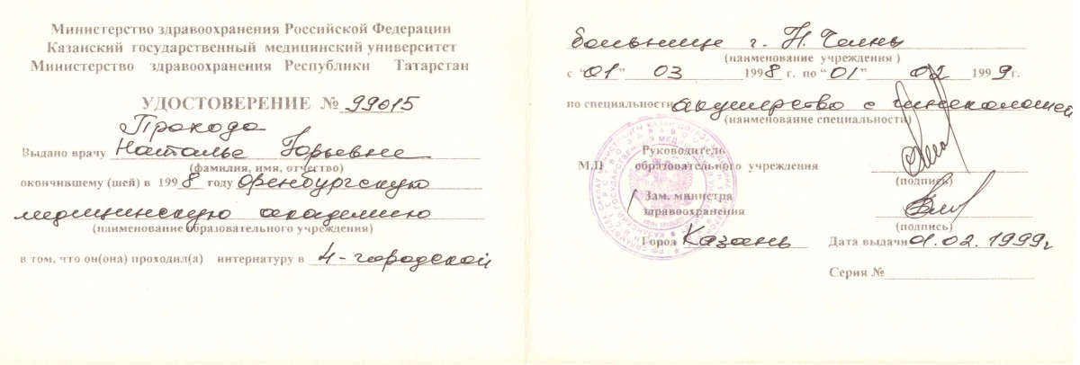 Казанский медицинский институт им. Курашова «Лечебное дело», диплом Г-I 377446