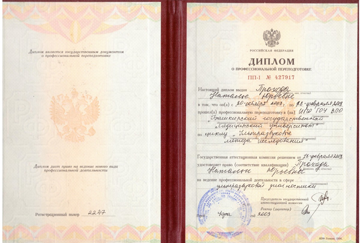 Переподготовка. Башкирский государственный медицинский университет «Ультразвуковая диагностика», Диплом ПП-1 № 849743