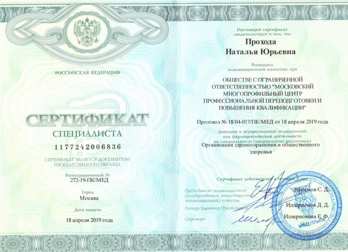 Сертификат «Организация Здравоохранения и общественного здоровья» № 1177242006836