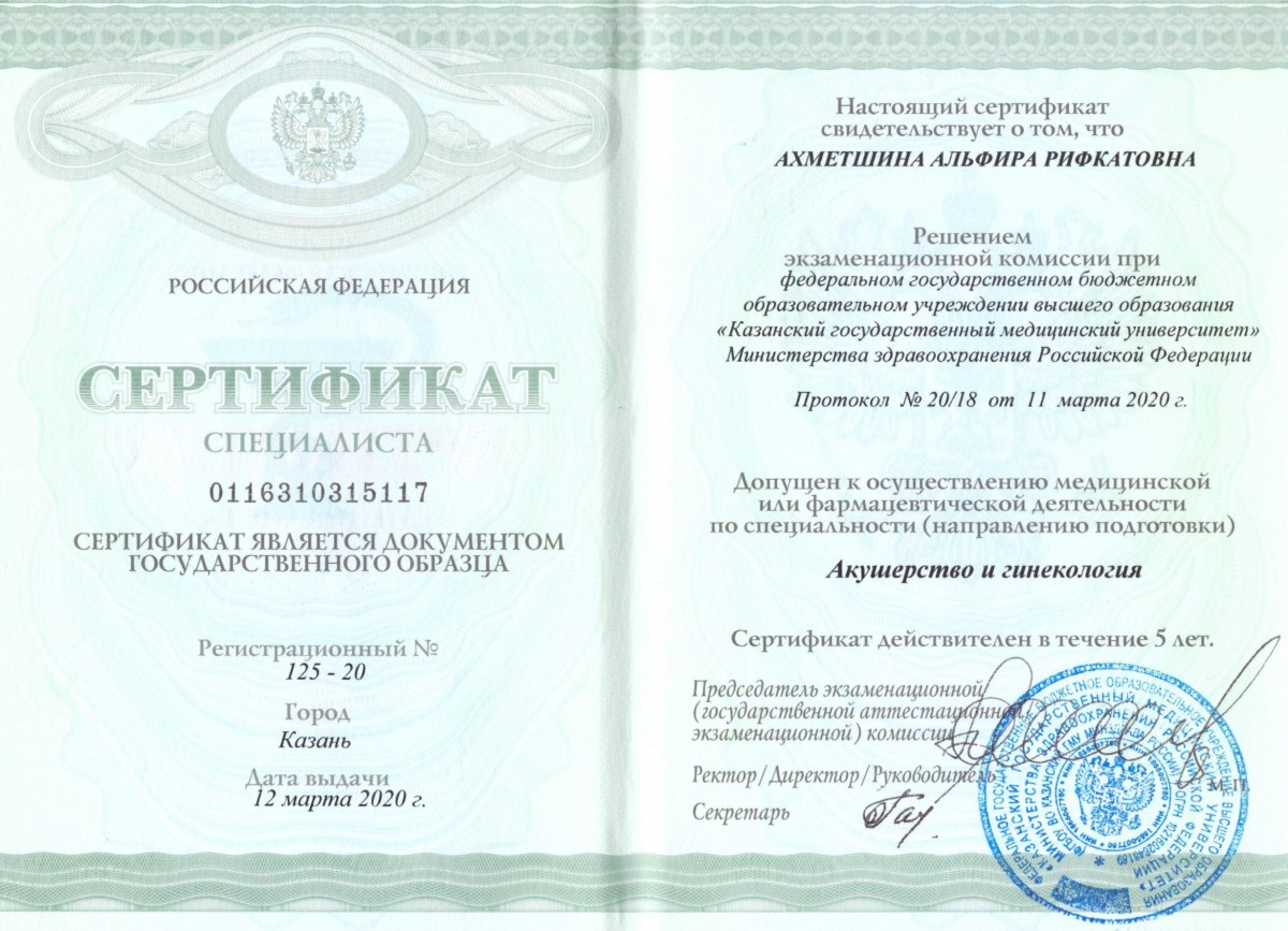 Казанский государственный медицинский университет, «Акушерство и гинекология», сертификат 0116310315117