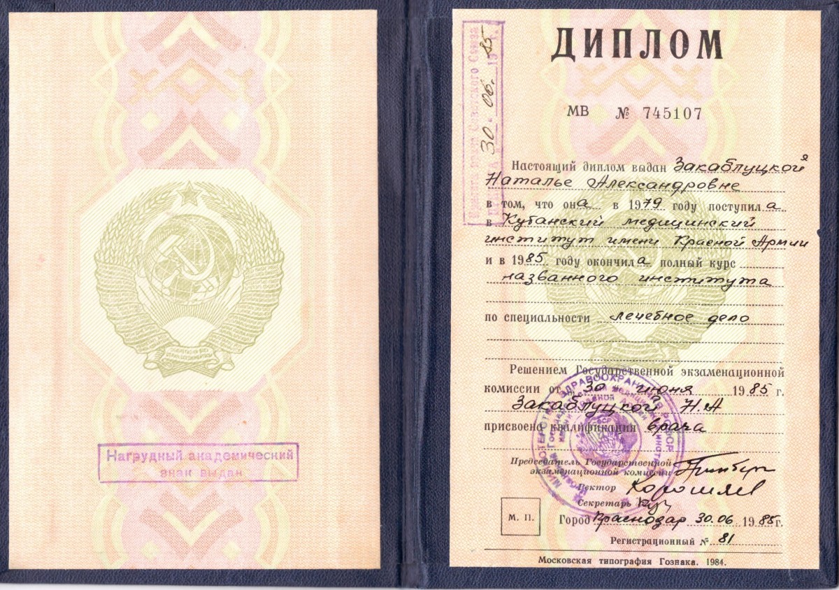 Образование: Кубанский медицинский институт им. Красной Армии «Лечебное дело»