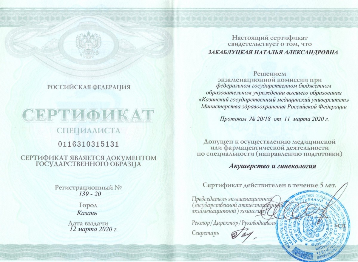Интернатура: Казанский медицинский институт им. Курашова, квалификация «Акушер-гинеколог»